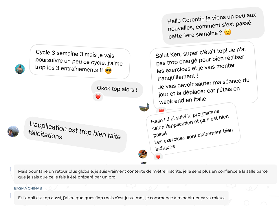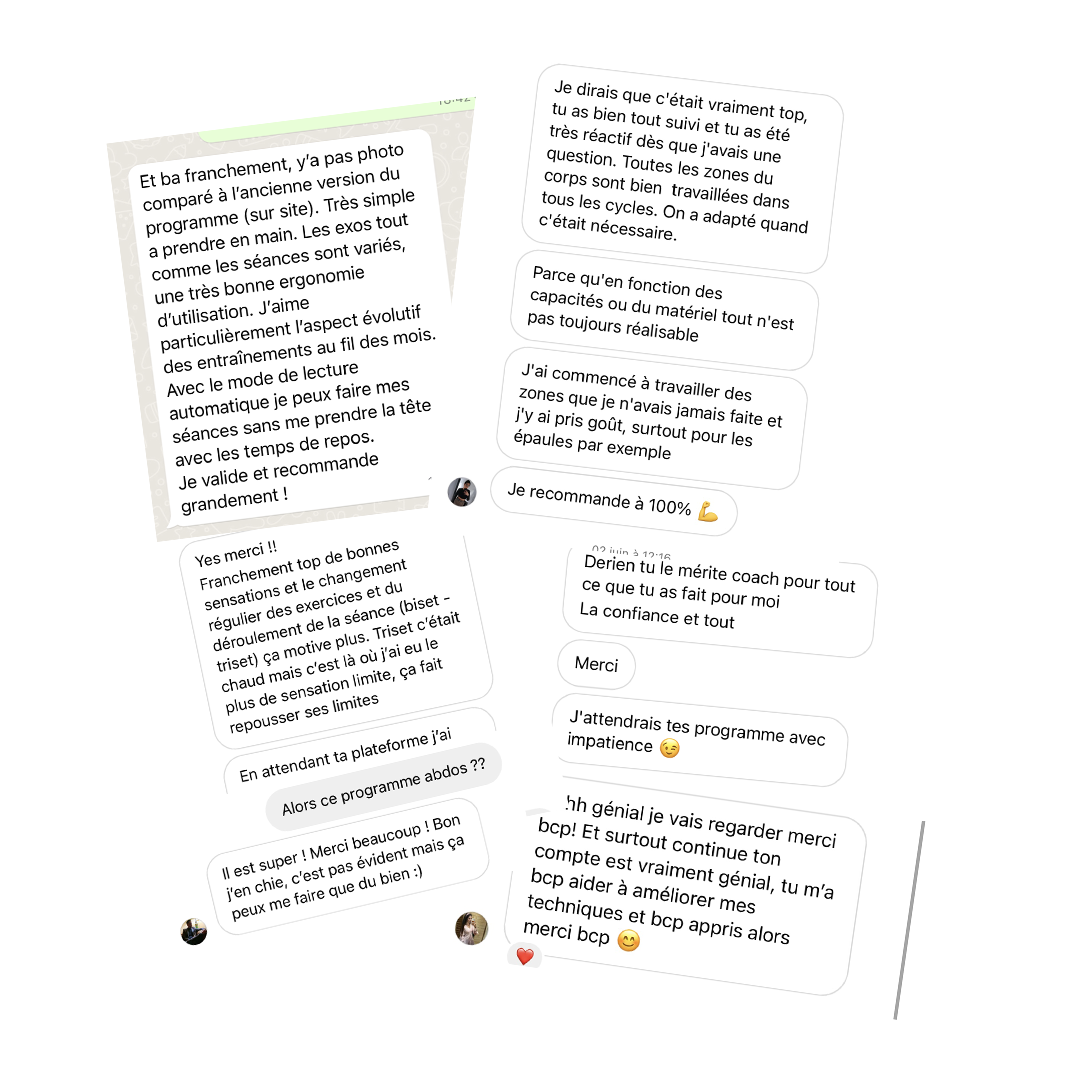 Des bilans en visios sont organisées toutes les 3 semaines pour faire le point sur les séances et adapter au mieux les programmes. Je suis disponible personnellement tous les jours pour répondre à tes questions via la messagerie de l'application ou WhatsApp en fonction de tes préférences.